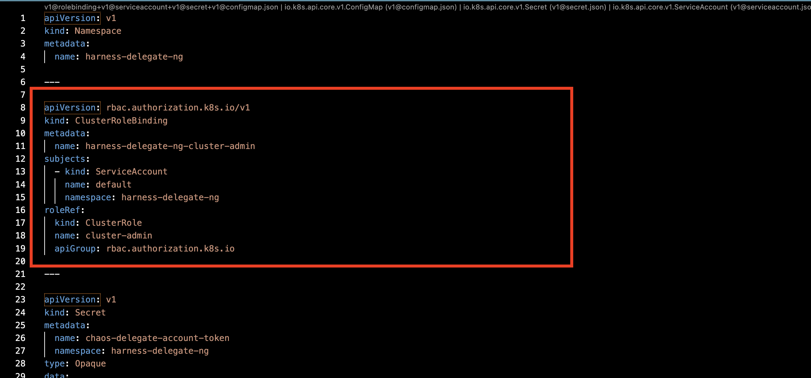 Create a new service account for the Delegate (to which you can assign a role further) in the dedicated namespace where the Delegate is installed. Here, chaos-delegate refers to the name of the service account in the Delegate.