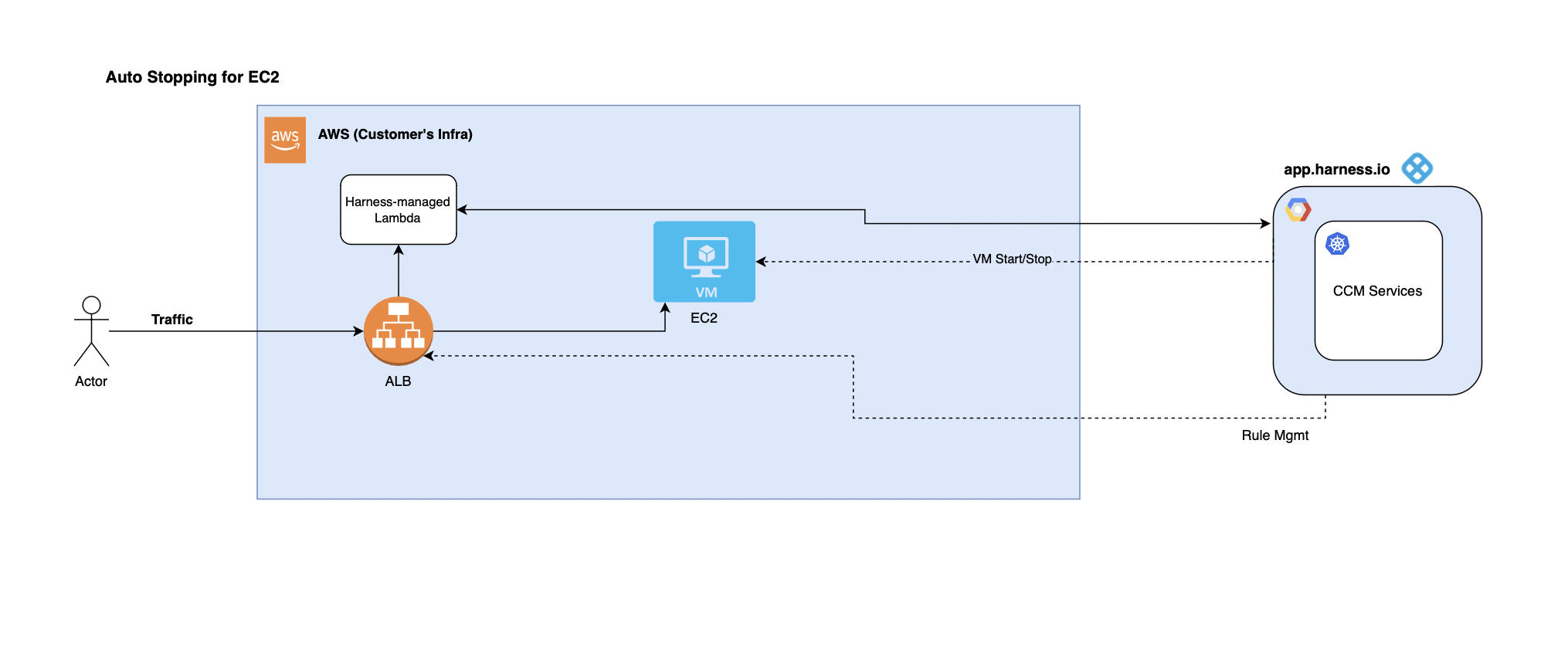 In this diagram, we will discuss about the interaction between CCM services and the customer's infrastructure, showcasing how AutoStopping for AWS VMs works. The onboarding process is marked by Harness taking a pivotal role in managing the existing Application Load Balancer (ALB) within the customer environment. In cases where no ALB is present, Harness initiates the creation of a new one. Simultaneously, a freshly instantiated Proxy Manager comes into play, diligently tracking traffic directed towards the target resources.