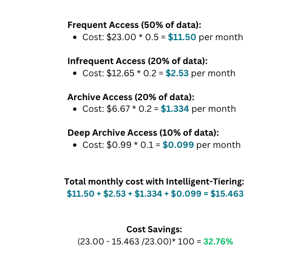 This results in a cost savings of approximately 32.76% compared to keeping all data in standard S3 storage (23.00permonthvs.23.00 per month vs. 15.463 per month).