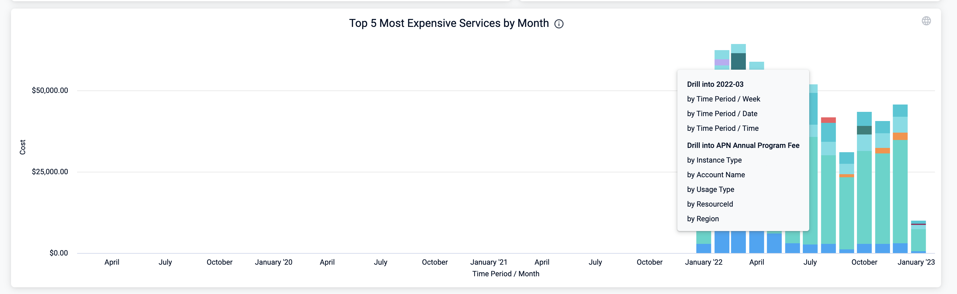 In Most Expensive Services by Month, click on the chart to further drill into the cost details: