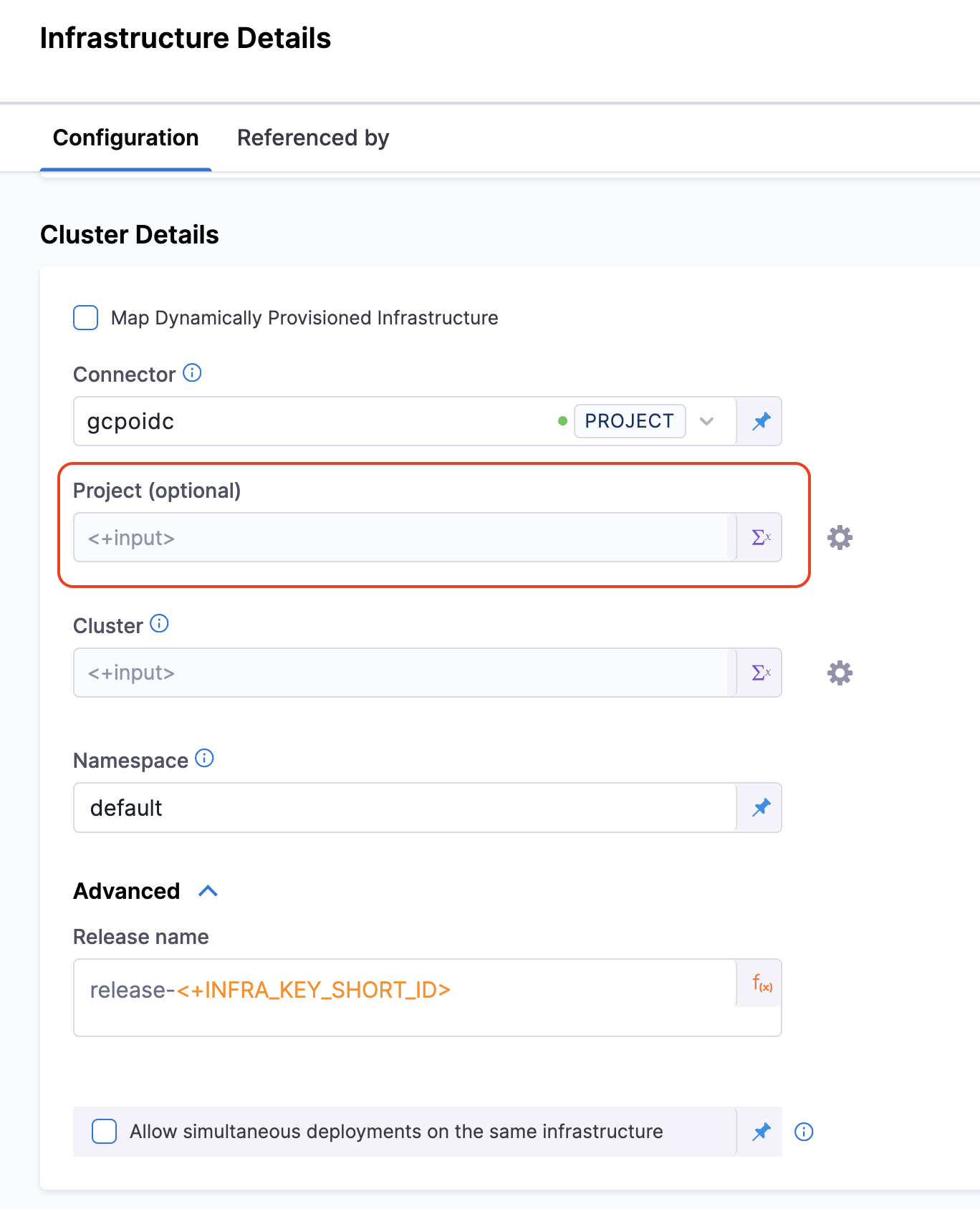 A Harness Infrastructure Definition includes specific infrastructure details for the deployment, such as the Harness connector that provides credentials for the cluster and the cluster namespace.
