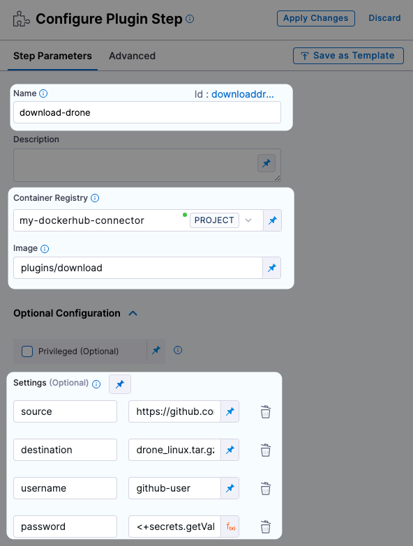 To demonstrate how to add a Drone plugin to a Harness CI pipeline, these steps use the Download plugin as an example. This plugin downloads an archive to the stage workspace.
