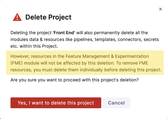 2. When all FME resources are deleted from your project, you can cleanly delete a project from the Harness Projects page: