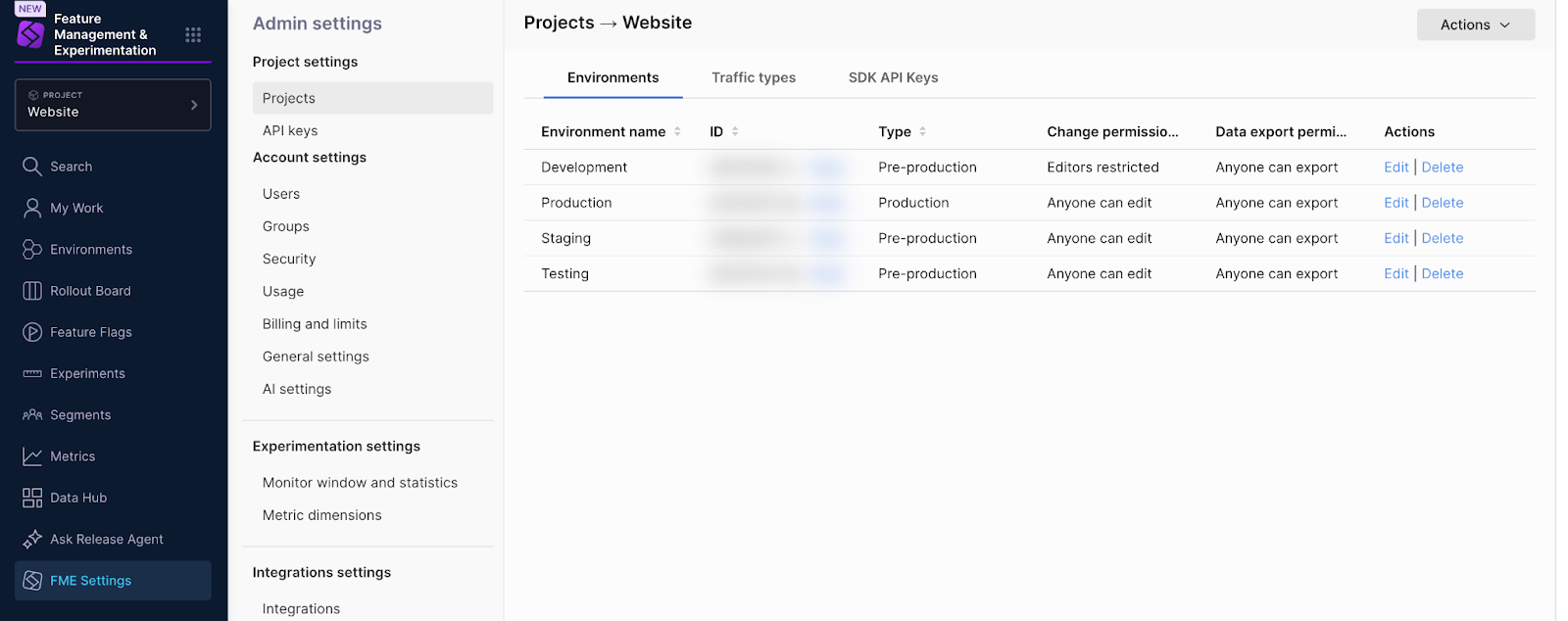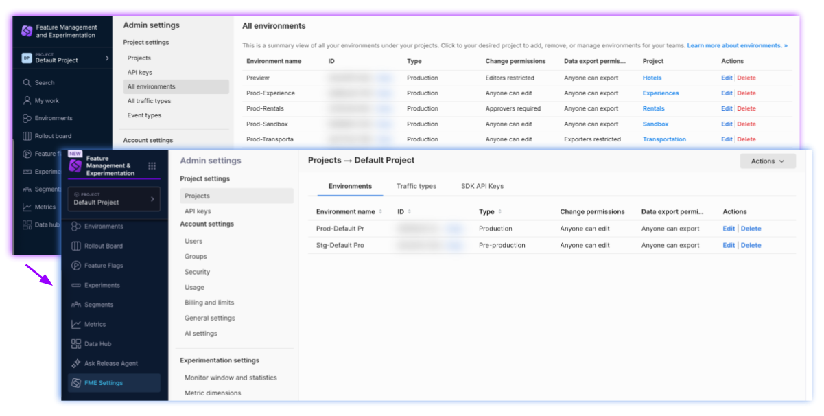 This Harness platform resource type is currently distinct and separate from environments defined for your project in Harness FME Settings (shown below).