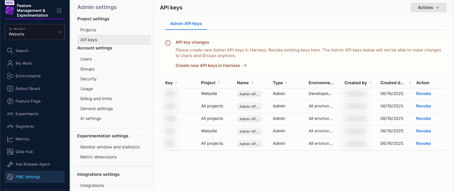 • SDK API keys: Authentication tokens used to authorize FME SDK requests. SDK API keys are managed by the Harness FME module.