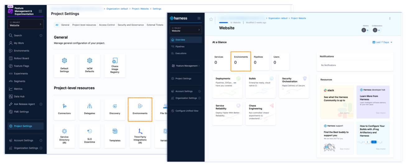 There is a Harness platform resource type called environments found in Harness Project Settings, Organization Settings, and Account Settings as well as on the project Overview page (shown below in Harness unified view).