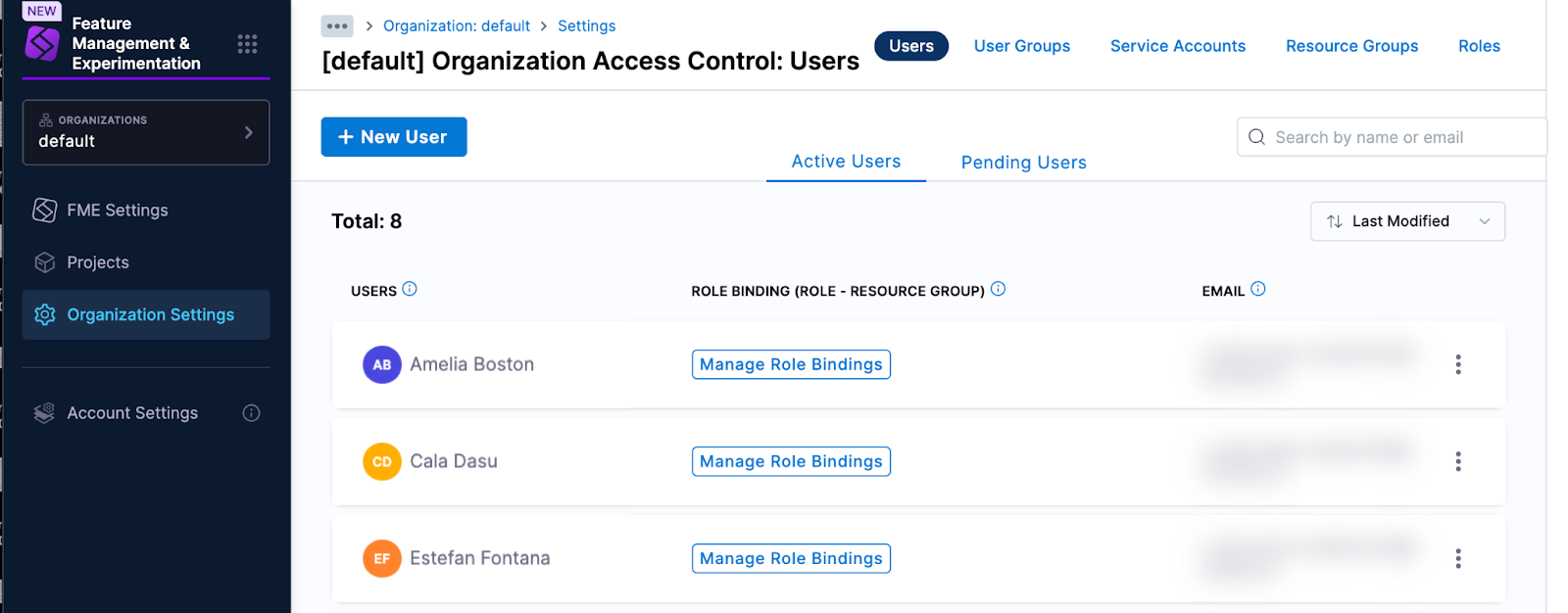 The RBAC permissions (that mimic legacy Split permissions) are set on the FME user group to which the new Harness user was added. You can learn more about these user group role bindings in the User Groups section.