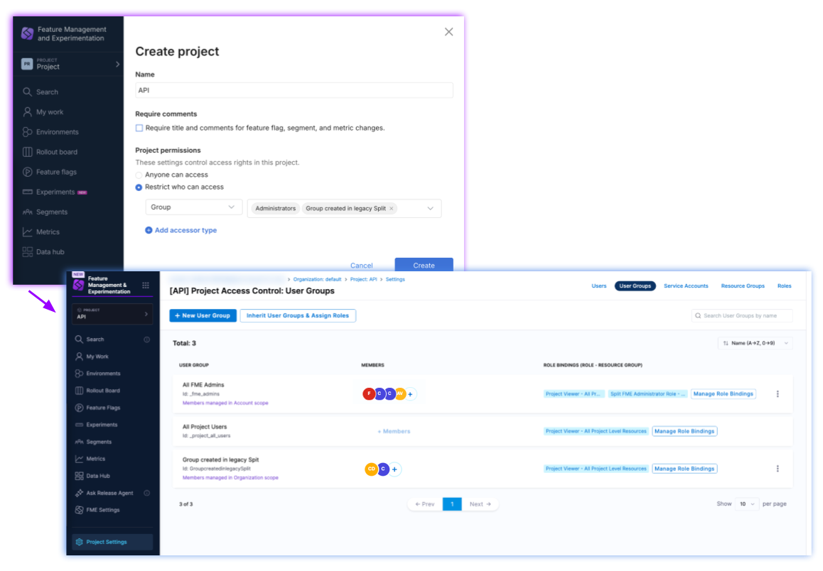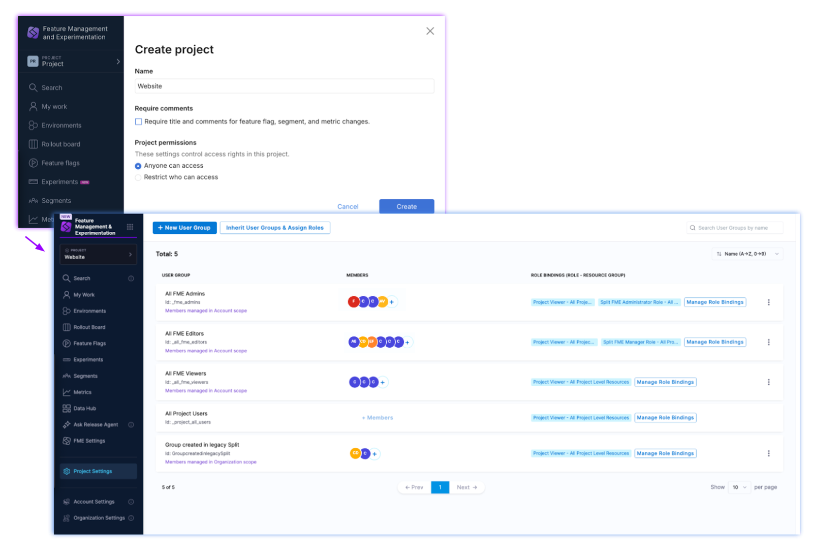 To grant similar permissions to your legacy Split settings, the new Harness FME user groups were inherited by Harness projects and the following role bindings were assigned: