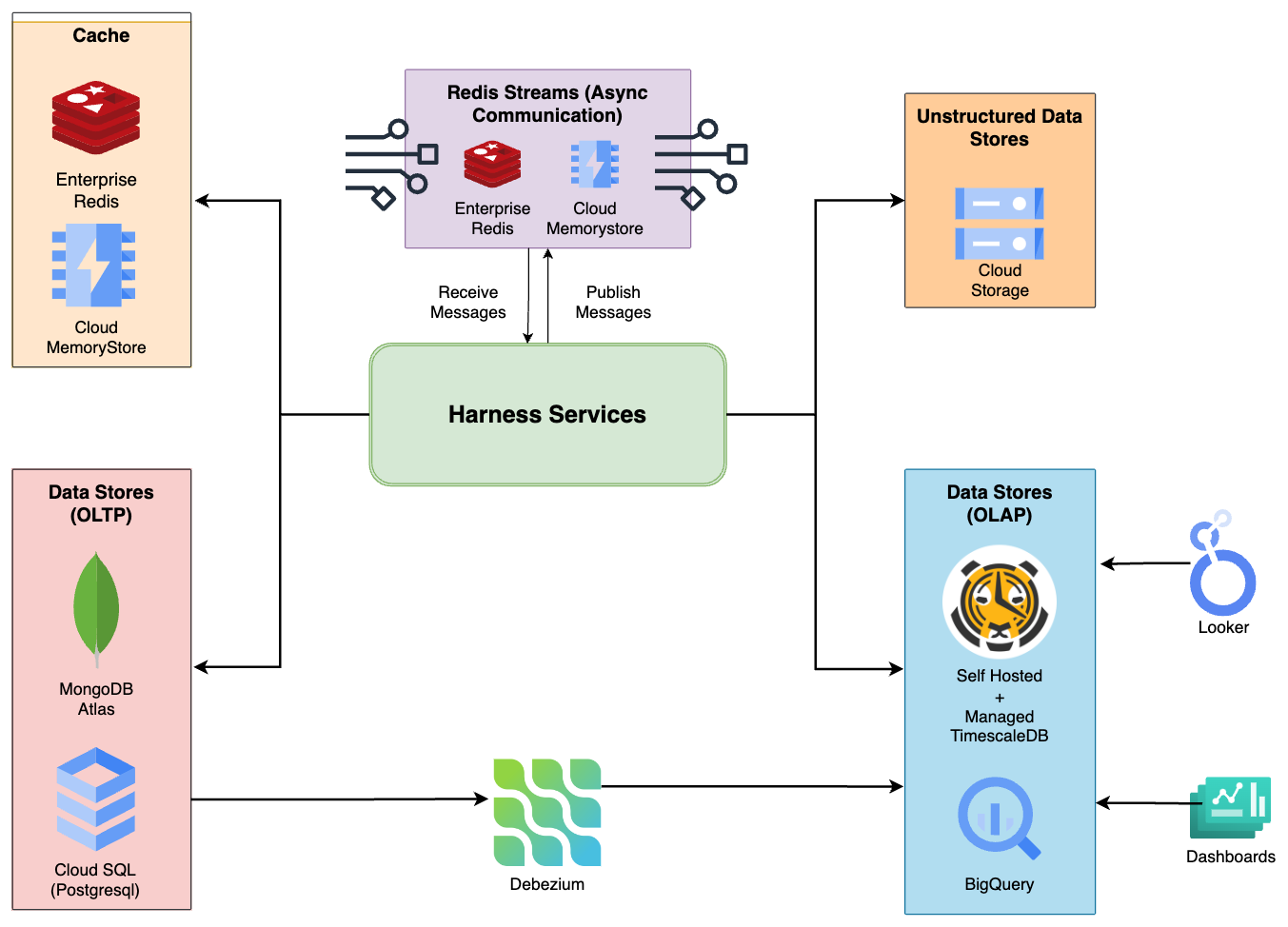 MongoDB Atlas and Cloud SQL handle the day-to-day transactional and operational data, while TimescaleDB and BigQuery are used for analytical data and dashboards. Debezium keeps the data between systems in sync. Enterprise Redis and Cloud MemoryStore are used as caches to improve performance and scalability. Cloud Storage is used for storing unstructured data like static assets, delegate/watcher binaries etc. Redis Streams is used as a pub/sub and for async communication between microservices.