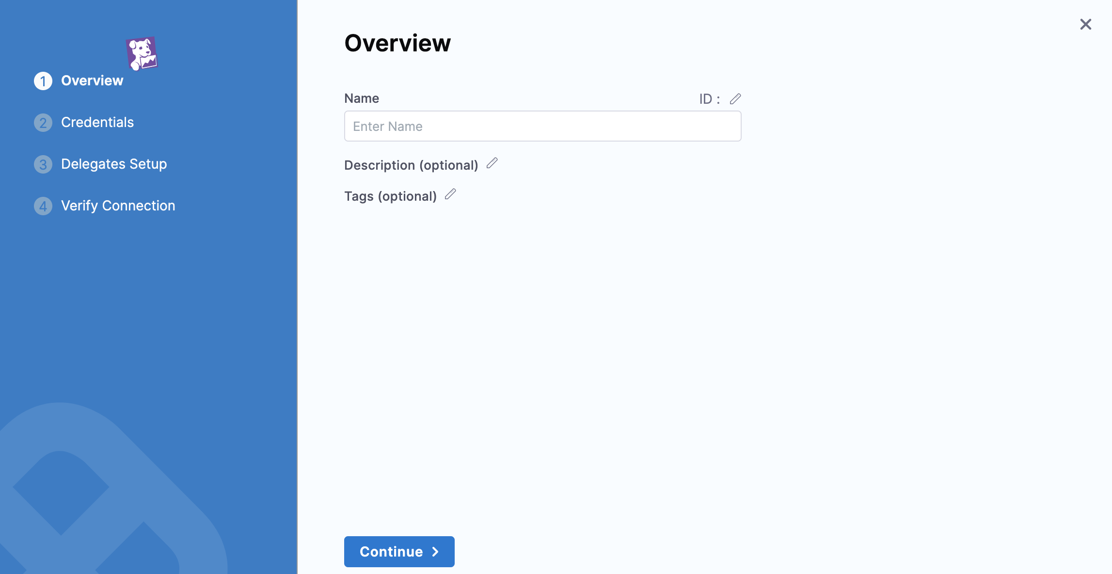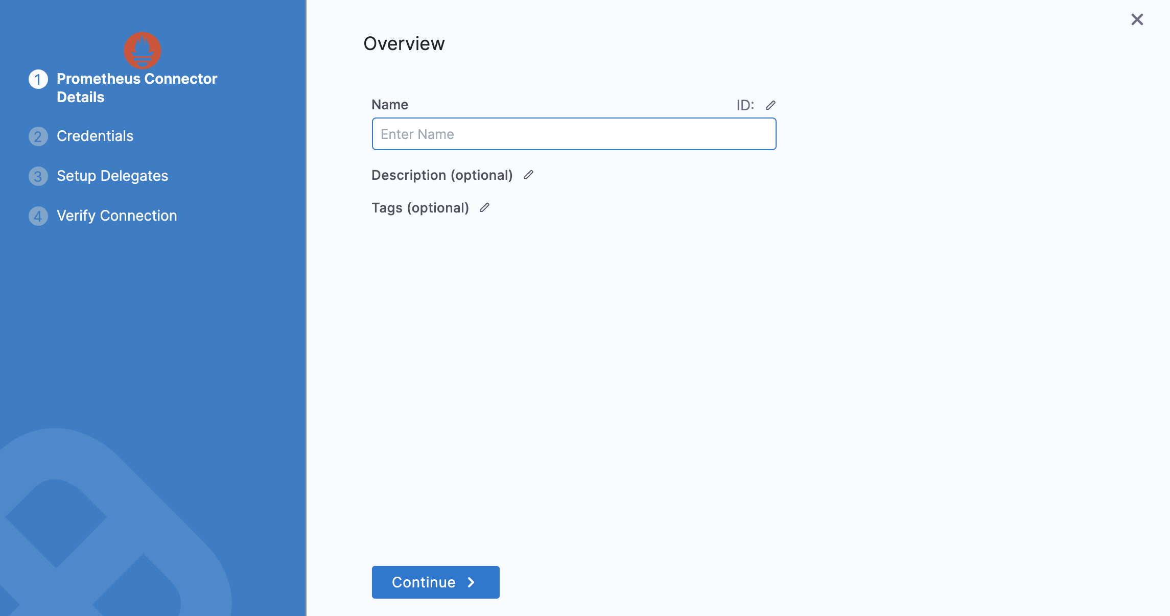 5. In the Overview tab, enter a name for the connector, an optional description, and a tag, and then select Continue. If you are going to use multiple providers of the same type, ensure you give each provider a different name.