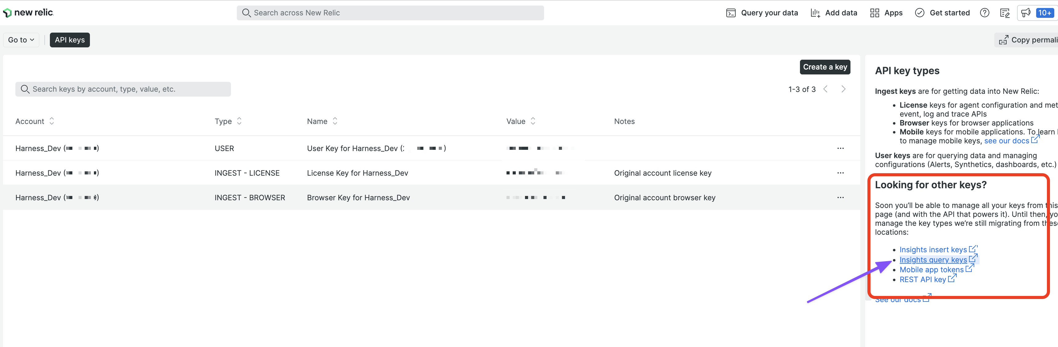 • If you have trouble finding the step on generating the Insights query key, look for the API key types help in the New Relic help panel: