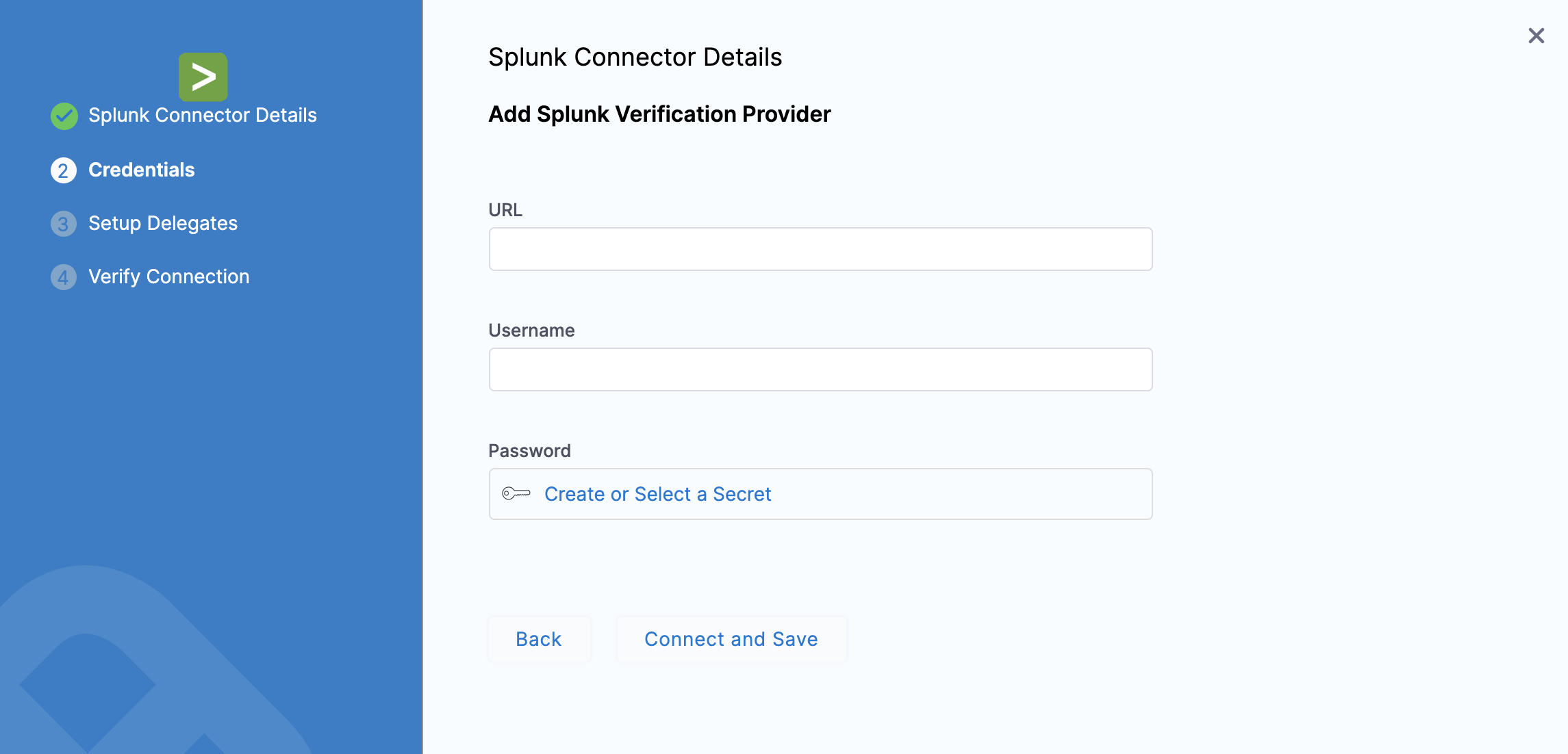 3. Click + Connector, and click Splunkin Monitoring and Logging Systems. The Splunk connector settings appear.