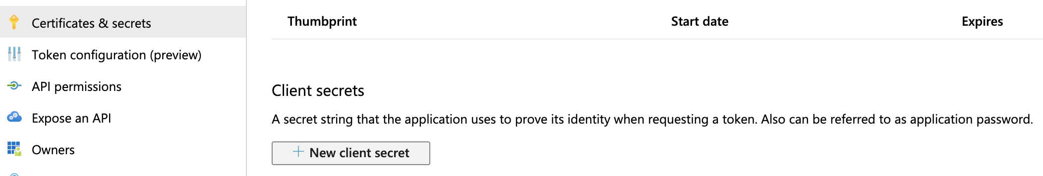 1. Navigate to Azure's Certificates & secrets page. (For details, go to Microsoft Azure's Create a new application secret documentation.)