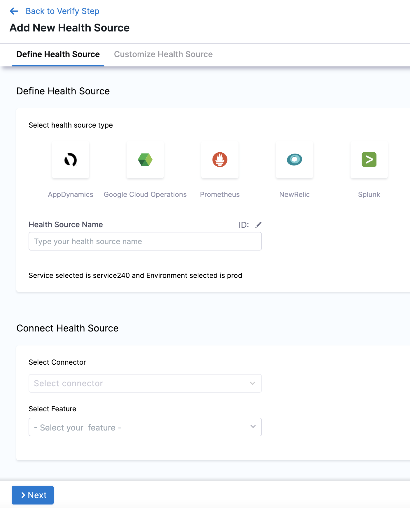 3. Go to the Service tab, and under Define Your Sources, select + Add New Health Source.