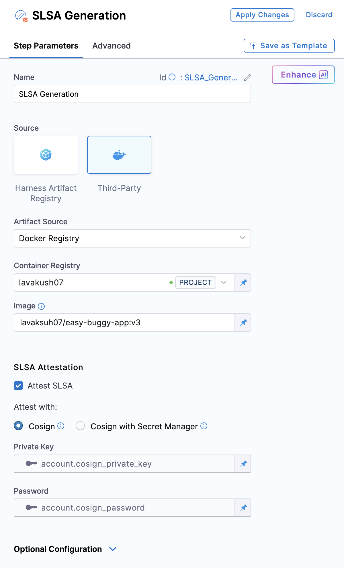 The SLSA Generation step enables you to generate SLSA Provenance and optionally attest it. The generated provenance is saved in the Artifact section in SCS, while the attestation file is pushed to the configured container registry. This step should be configured immediately after completing your image-building process, as the image digest is required for provenance generation and attestation.