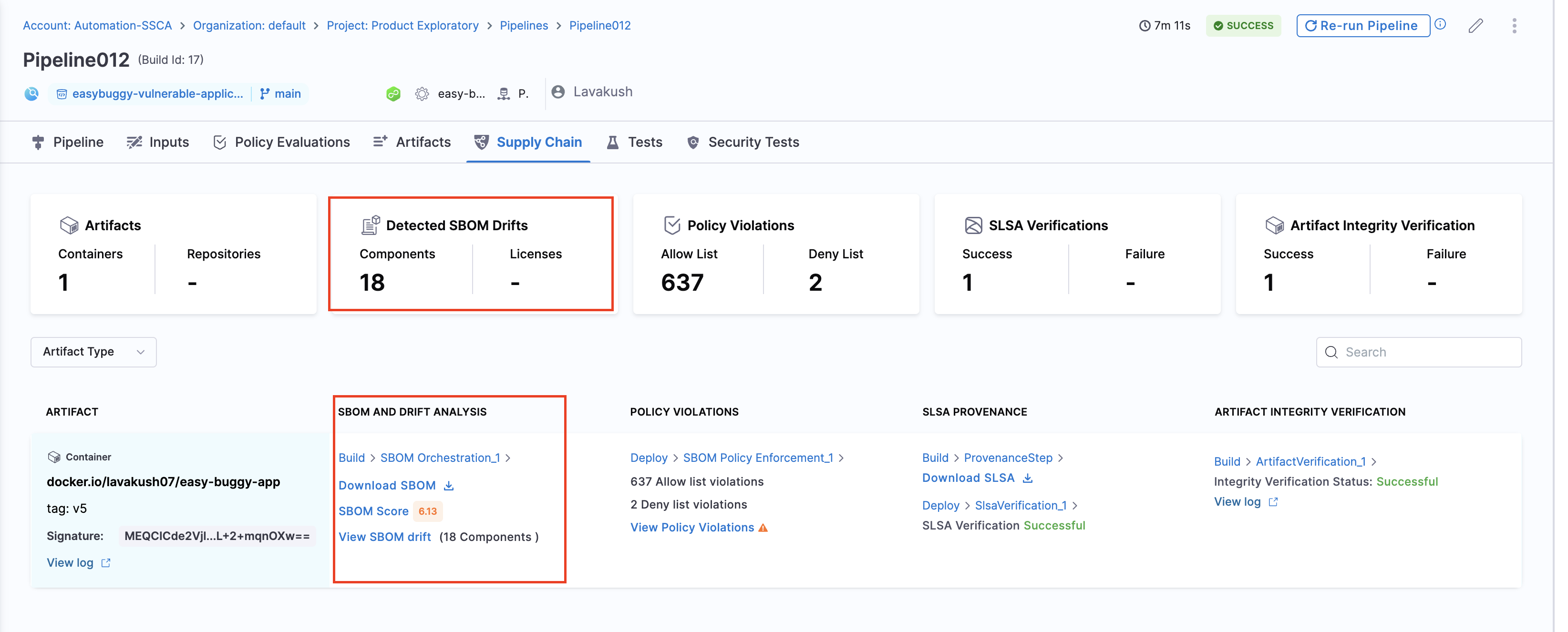 - Stores the SBOM in Harness and uploads the