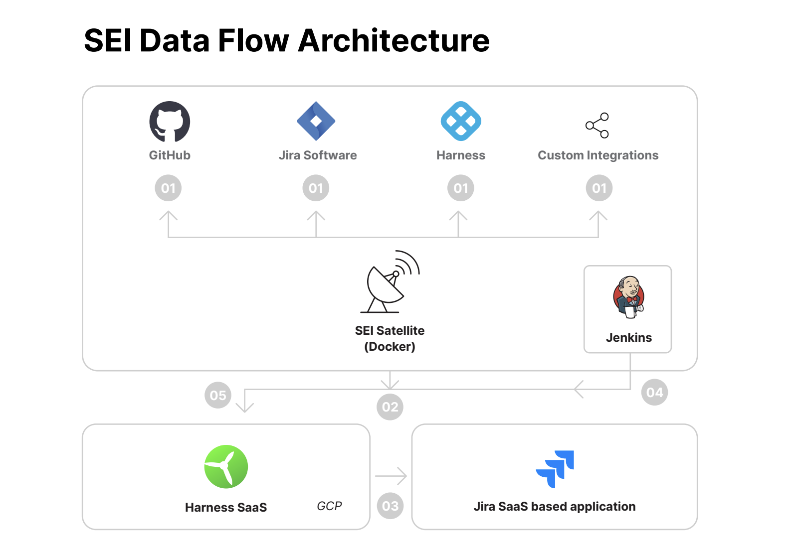 - Jenkins integration: The Harness SEI Jenkins Plugin is installed on the user’s Jenkins server. This plugin securely connects outbound to the Harness SEI SaaS application, allowing licensed users to access the SEI UI portal via secure transport.