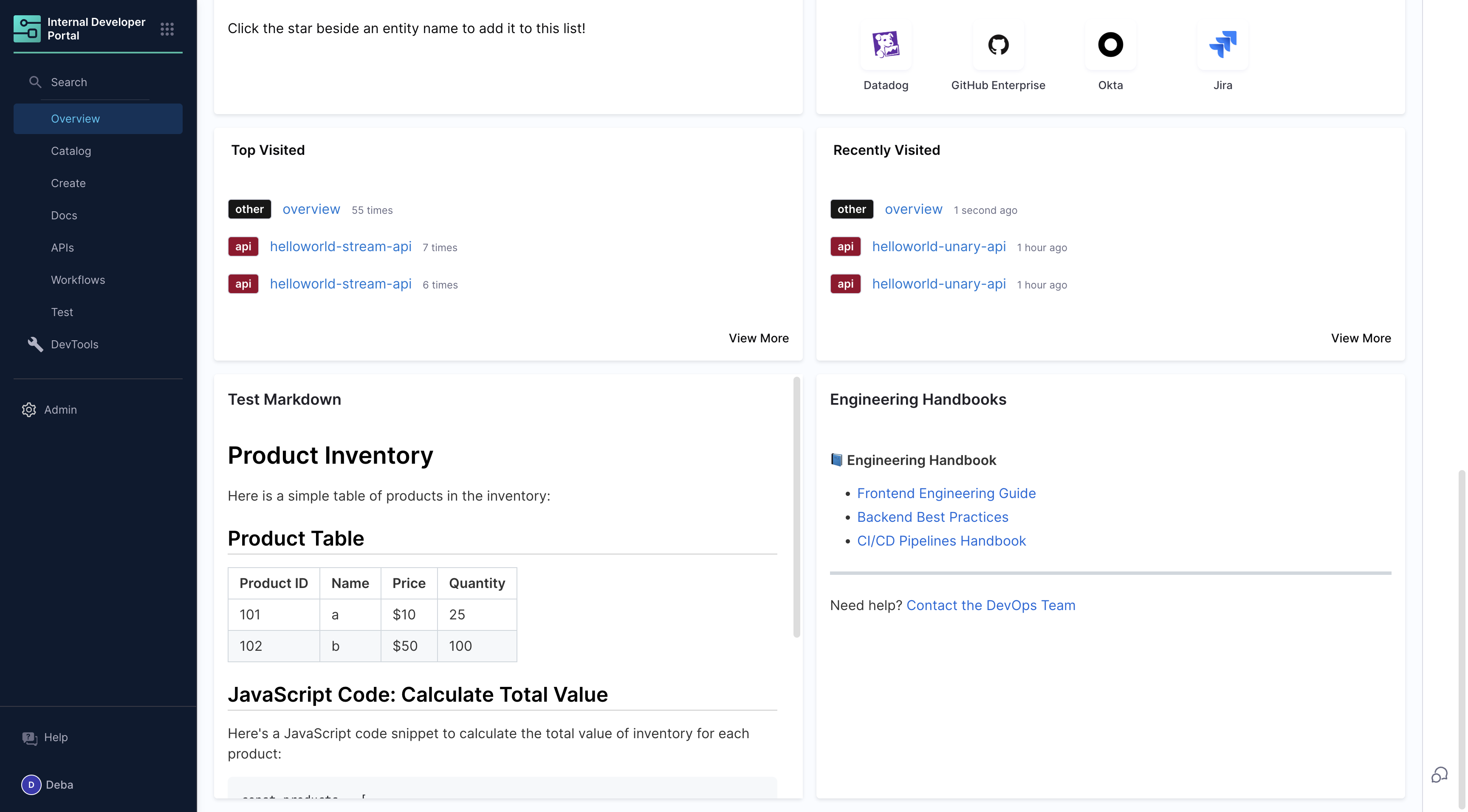 • External Content Integration - Add documentation, dashboards, or any web content directly in your IDP navigation