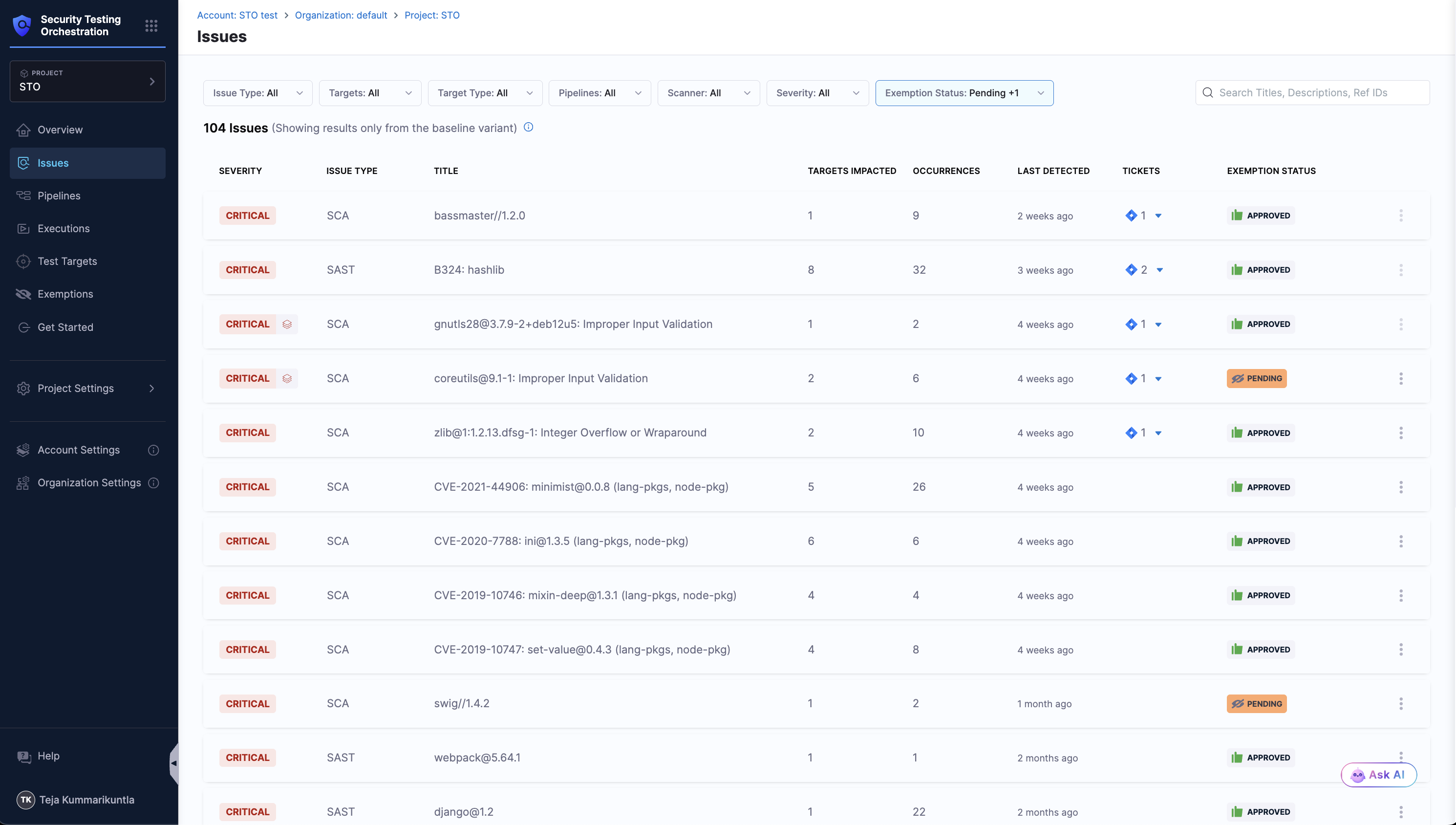 - Dedicated Security Exemptions Section: Ability to grant and manage security exemptions by SecOps owners on identified vulnerabilities or issues during security testing. Exemptions can also be made in the STO Pipeline against specific issues.